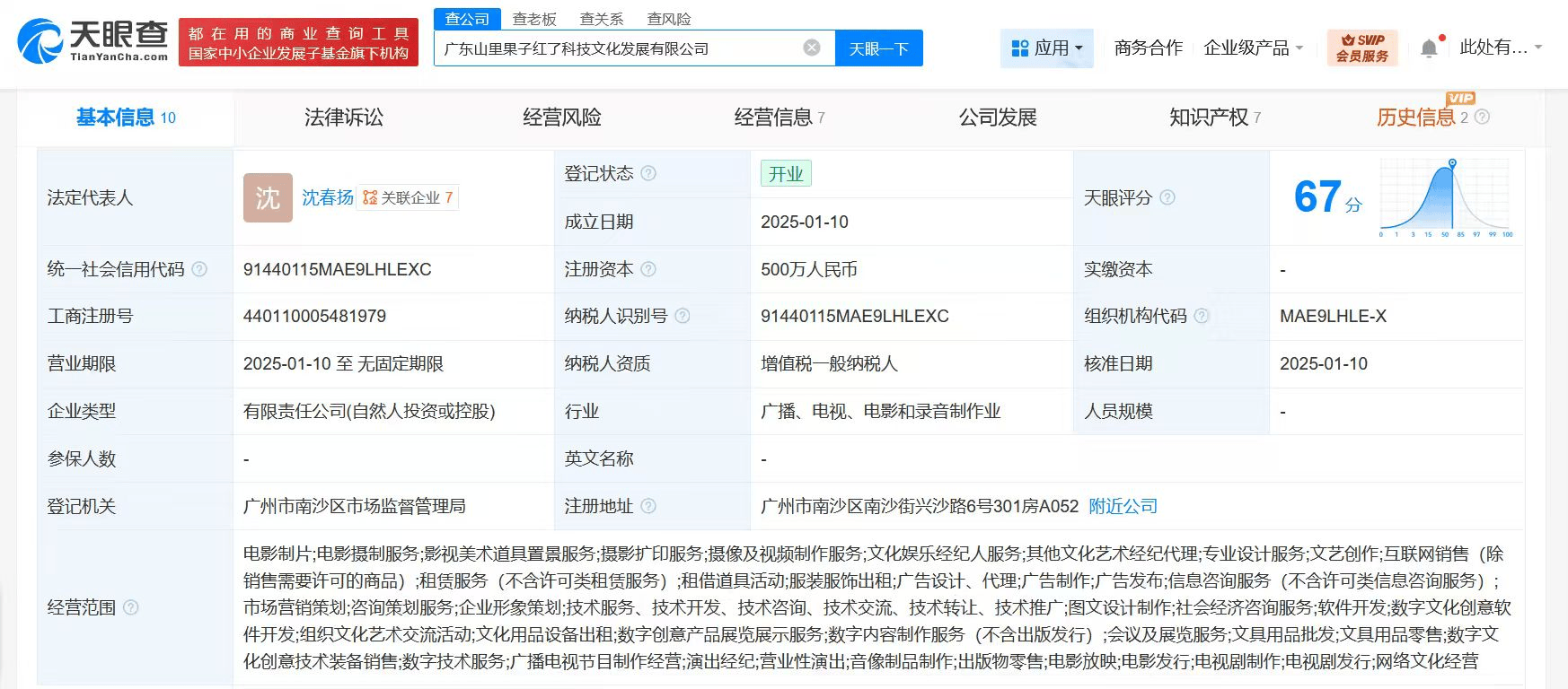 广东山里果子红了科技文化发展有限公司成立于2025年1月,法定代表人沈春扬,注册资本500万元,主营业务涵盖电影制片、摄影摄像服务及文化经纪等领域。公司股东包括沈鹤(小沈阳)、陈武东等人。值得关注的是,该公司近日已完成对描声文化传播(北京)有限公司的战略投资,持有其6%股权,正式涉足艺人培训领域。